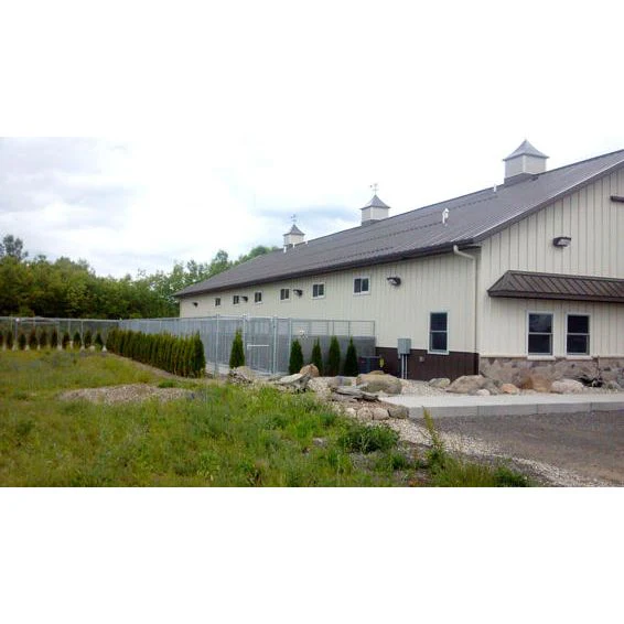 The square tubing frame holds 6 gauge 2×4 welded wire mesh. The inside of the frame is pre-drilled around the entire inner perimeter; then each end of the wire mesh is inserted into the pre-drilled frame and welded around every wire. This is the most secure way to fasten the wire mesh to the frame and eliminates exposed sharp or jagged edges which could injure your pet. This design also provides a quiet kennel with no rattling of the fence like other chain link versions. Most other brands just weld the wire mesh to the surface of the frame every six to twelve inches which means some of the wire mesh ends can be bent out and injure your pet.